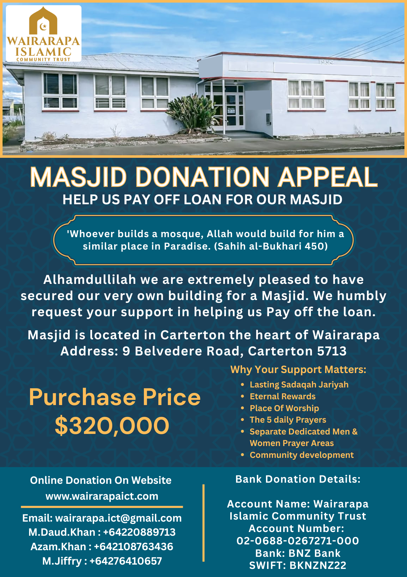 Wairarapa Islamic Community Trust is fundraising for a Masjid in Carterton, Wairarapa, New Zealand. The Wairarapa Islamic Community Trust, based in the Wairarapa, the Wellington Region, has signed a sale and purchase agreement to purchase a property at 9 Belvedere Road, Carterton, located in the heart of the Wairarapa. The property is intended to serve as a permanent place of worship and a community gathering space.